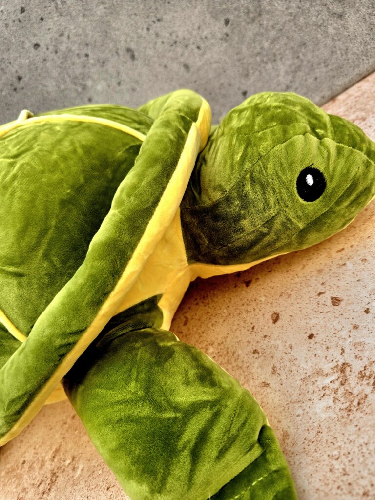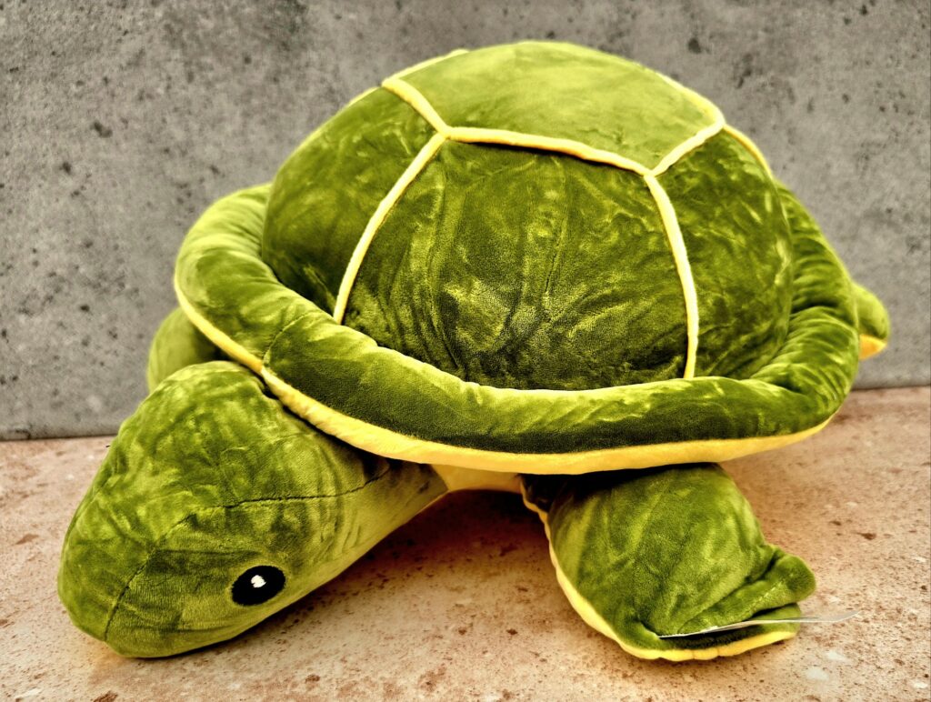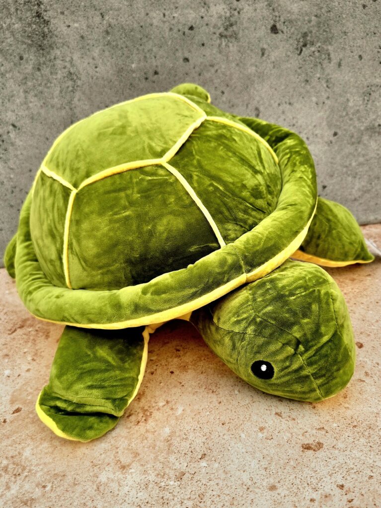 Ona jest wielka – Żółw ogormny. Trochę to jest poduszka, trochę przytulanka, z pewnością wielka kapsuła wspomnien. Zabawka, która wzbudza wspomnienia. Pezywiezion znad Bałtyku, chodz tam żółwie nie występują 🙂 Ale gdy szukasz przyjaciół, pamiętnik też Żółw jest nieodzowny. Pluszowy. Piekny. Miło było mieć czysta przyjemność trzymać ta wyjatkowa zabawkę w rękach.