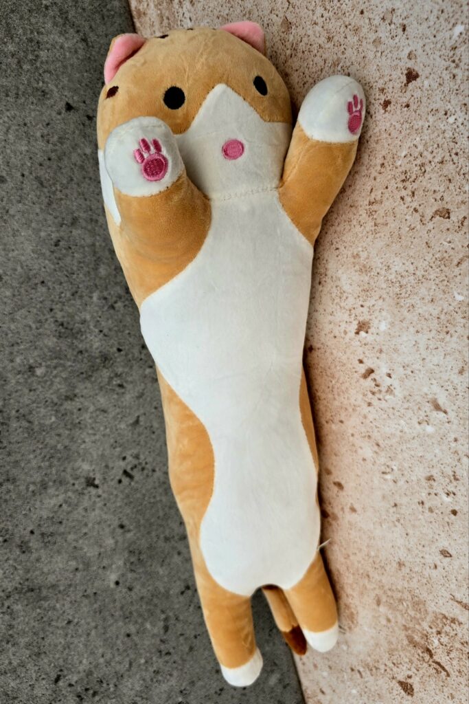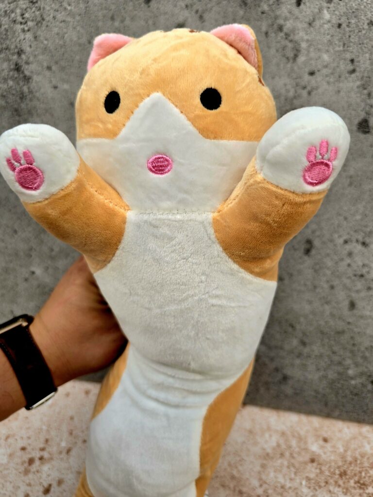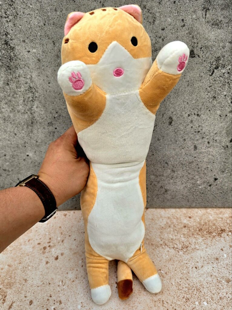 To było jakby odkrycie na nowa tego, że maskotki są przyjazne. To przyjaciele, gdy nie masz z kim pogadać, gdy Dziecko czuje się źle, gdy nie ma kogo przytulić. Ten Kot parówka to wspomnienia z 2019 r. Mniej więcej wtedy się pojawiły. Zaczęły królować w sieci, na straganach. Ludzie je pokochali. Były mniejsze i większe w trzech podstawowych kolorach: beżowym, szarym i różowym. Wytrzymały lata, do dziś trafia na nowych właścicieli, a nam przede.wszysrkim dobrze się kojarzą.